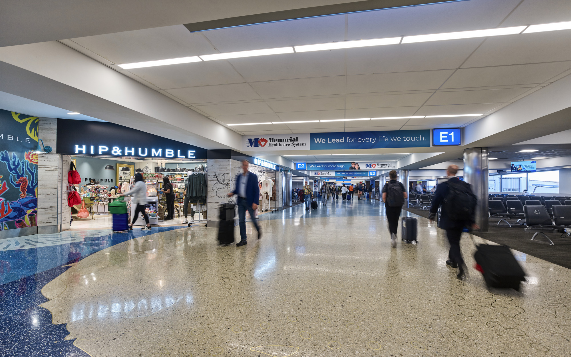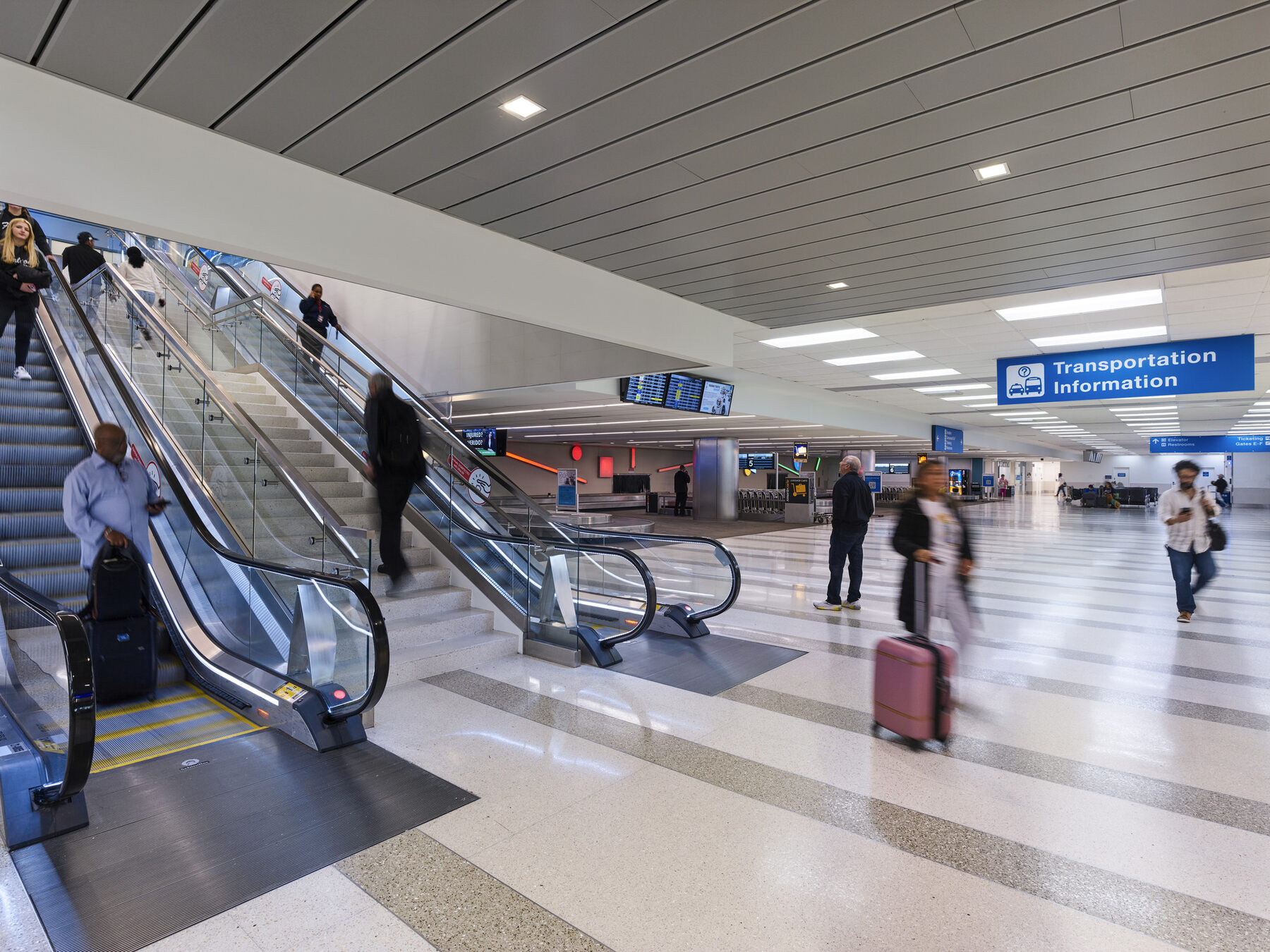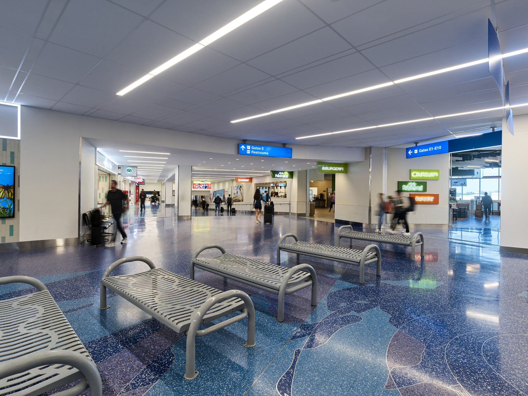 The primary goal of the Terminal 3 modernization project is to provide travelers with a modern, efficient, and visually appealing facility. One major improvement is the full redesign of passenger circulation, creating clear separation between arriving and departing travelers. This separation streamlines movement, reduces congestion during peak times, and shortens waits at ticketing and security by eliminating wayfinding conflicts. Most retail and dining options have been relocated post-security, with additional offerings added to enhance the passenger experience once they clear screening. The overall interior aesthetic of the terminal has also been significantly improved; Gresham Smith redesigned and expanded restrooms, replaced all wall and ceiling finishes, installed new terrazzo flooring, and implemented updated wayfinding features to create a polished and cohesive look that aligns with the broader FLL terminal modernization vision.